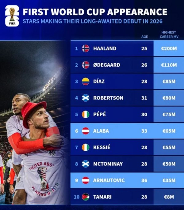11月20日讯 寰球杯预选赛仅剩附加赛限额待定,多支国度队已毕了晋级梦念念,《转会市集》也列出了多位还是为寰球杯首秀恭候多年的名将。 德转列有望寰球杯首秀名将:当昨年岁及巅峰身价 1.哈兰德 (挪威),25岁,2亿 2.厄德高 (挪威),26岁,1.1亿 3.路易斯·迪亚斯 (哥伦比亚),28岁,8500万 4.罗伯逊 (苏格兰),31岁,8000万 5.尼古拉·佩佩 (科特迪瓦),30岁,7500万 6.阿拉巴 (奥地利),33岁,6500万 7.凯西 (科特迪瓦),28岁......查看更多