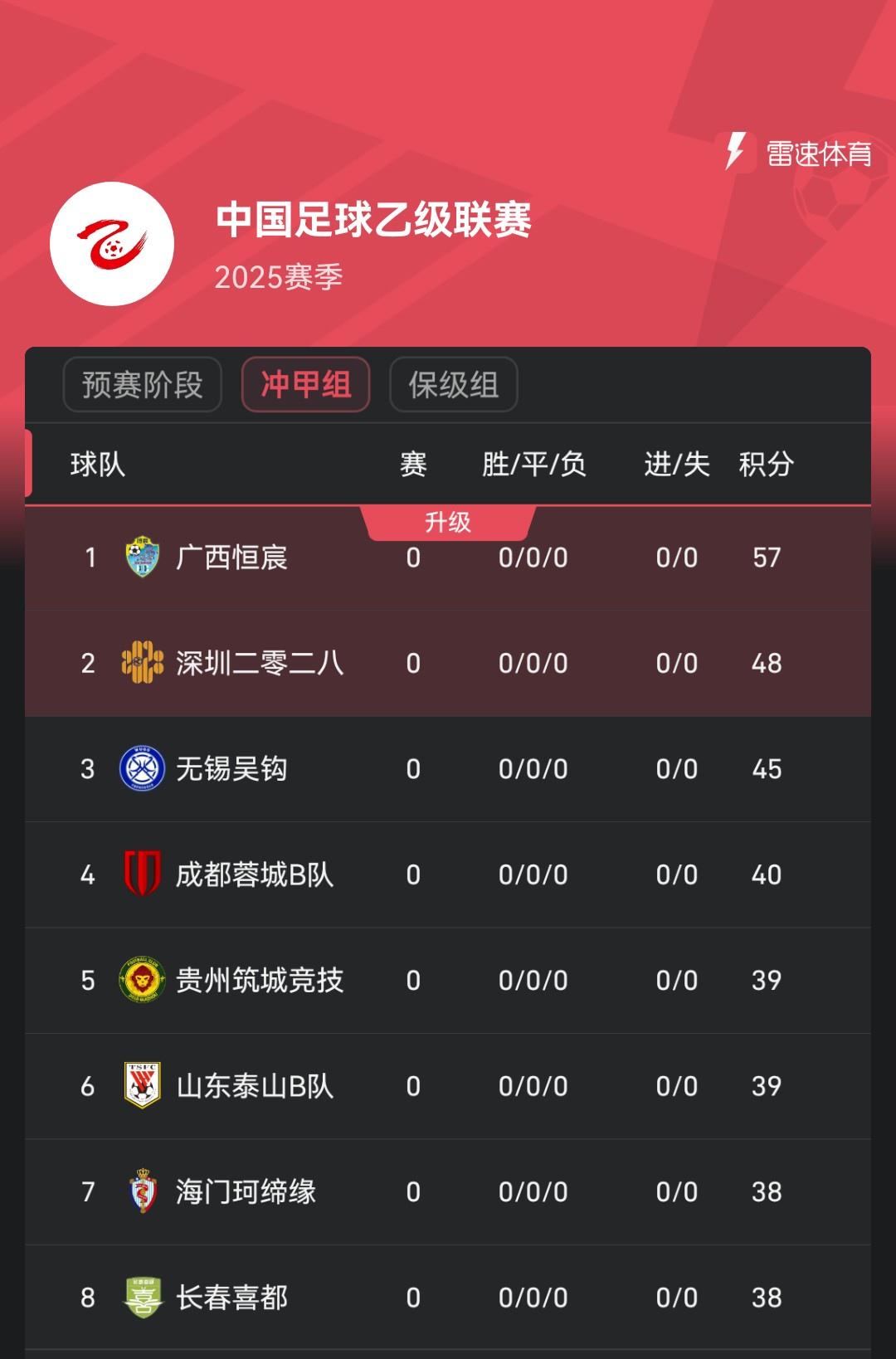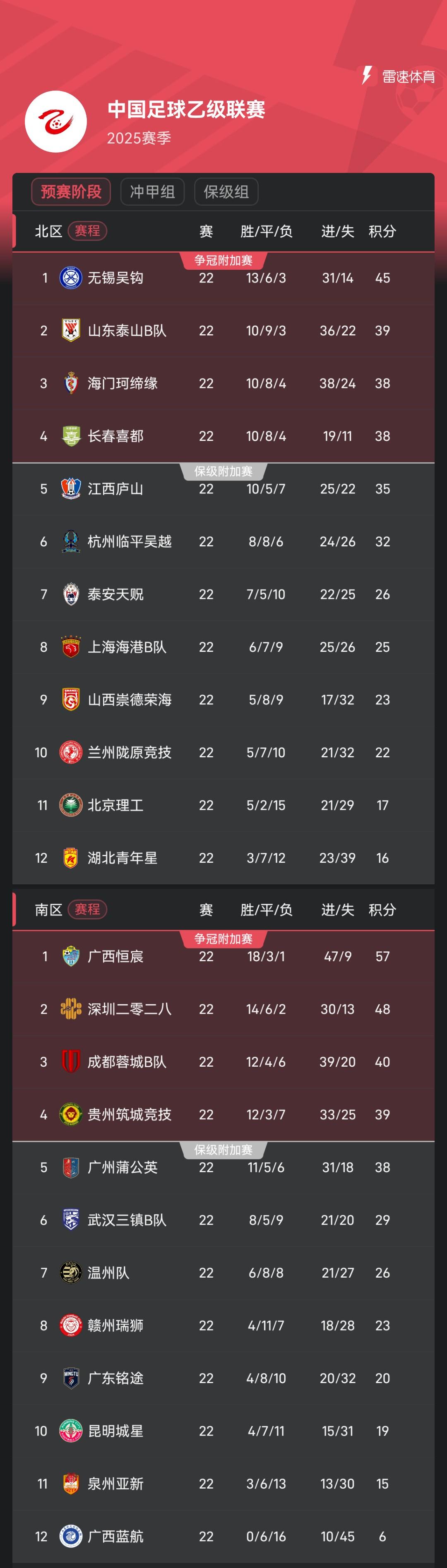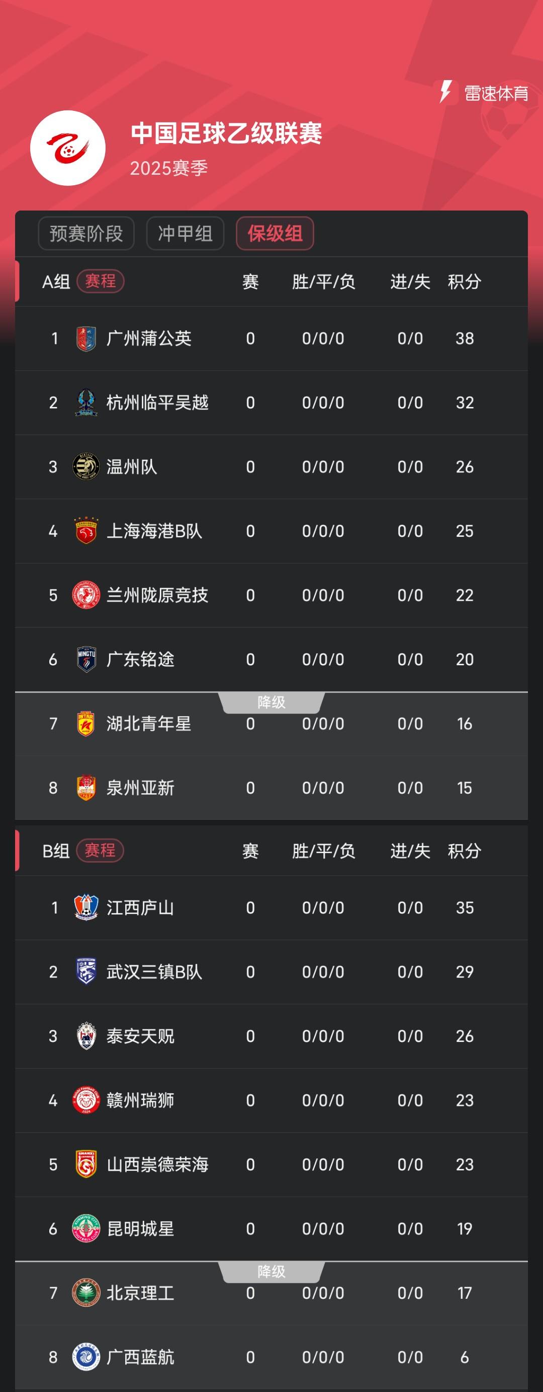 雷速体育8月4日讯 昨日,2025中乙联赛初赛阶段22轮比赛一起死一火,广西恒宸、山东泰山B队、成王人蓉城B队等8支球队插足冲甲组,另外16支球队插足保级组。